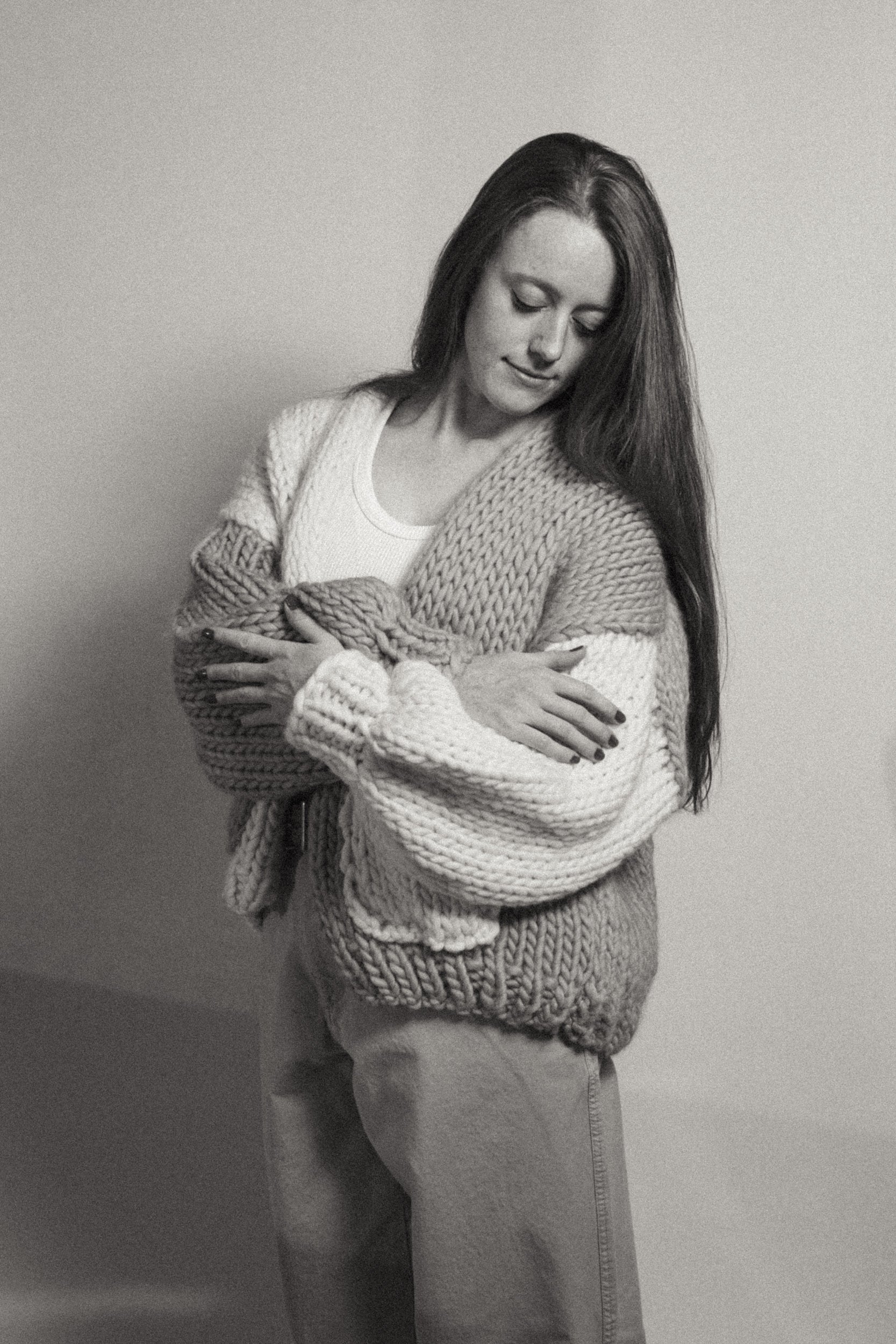 Every knit from Happy Thought is made lovingly by hand, in a home near Cleveland, Ohio, amongst the hustle and bustle of a busy young family. When you buy from our shop, not only are you investing in an addition to your wardrobe that will last for decades—you're also supporting an artist. Happy Thought is about a dedication to fashion with longevity, handcrafted apparel for your forever wardrobe. A cardigan takes 14 hours to make. A vest takes 4. A balaclava takes 3. And that element of making is a huge component of the brand.